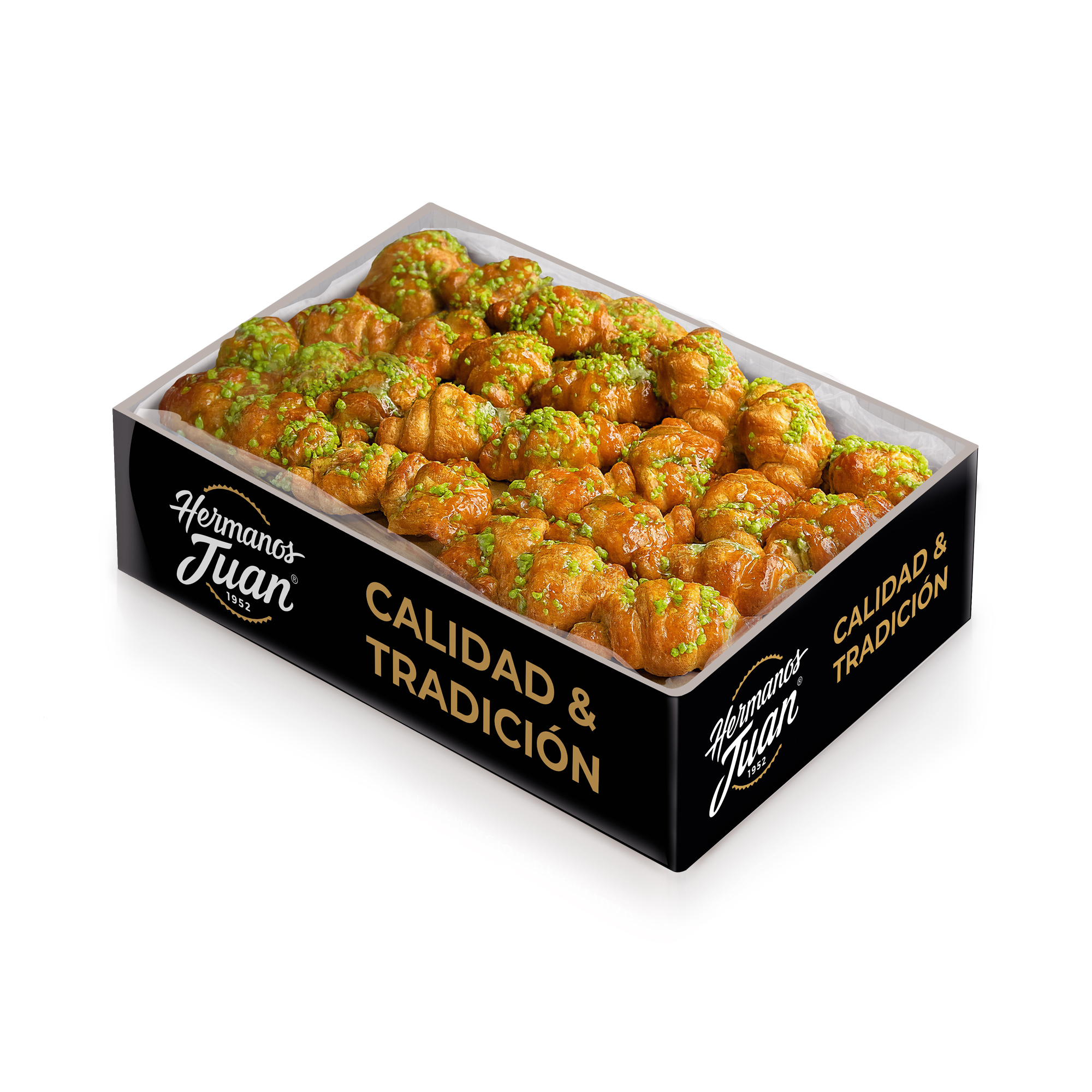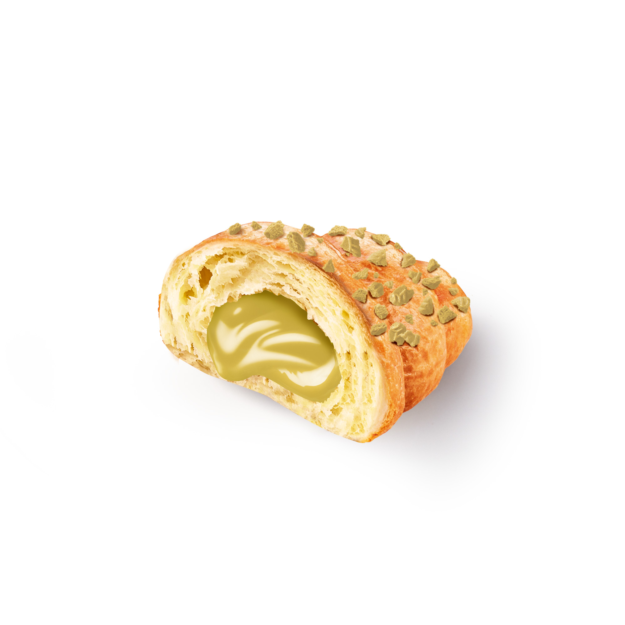 Relleno de crema de pistachos (35%) [azúcar, grasas vegetales (palma, palmiste), LECHE desnatada en polvo, PISTACHO (5%), LACTOSA, aceite de girasol, emulgente: lecitina de SOJA, colorantes: E-100 y E-141ii], harina de TRIGO, agua, azúcar, grasas vegetales (palmiste, palma) en proporción variable, jarabe de glucosa y fructosa, levadura, emulgentes: E-471, E-492, E-322, E-472e y E-481, HUEVOS (1%), sal, espesantes: pectinas, E-414 y carragenano, LECHE en polvo, aceite de girasol, proteínas de la LECHE, estabilizantes: E-466 y goma guar, acidulante: E-330, conservador: E-202, corrector de acidez: E-331, aromas, y colorantes: E-133, E-161b y carotenos. Huevos de gallinas sueltas en el gallinero. Puede contener trazas de mostaza, granos de sésamo, otros frutos de cáscara y/o productos derivados.